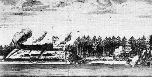 French bombardment of York Fort in 1697 from La Potherie’s Histoire de l’Amerique Septentrionale. This sketch illustrates York seven years after Henry Kelsey’s first trip inland from the post in 1690.
