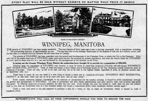 When Crescentwood was developed by real estate agent C. H. Enderton, Winnipeg was a “progressive” community, touted far and wide by its leading businessmen as Canada’s answer to Chicago, the gateway to the west. Because of favourable freight rates, goods shipped from the east were cheaper when ordered through a Winnipeg wholesaler, than when ordered direct from Toronto. Ashdown, Galt, Riley, Whitla, Alsip, Dyson, Hutchings, and many others, moved products from Winnipeg westward.