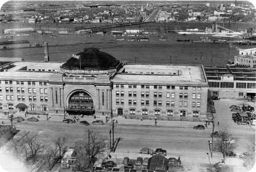 Flood waters at the Forks of the Red and Assiniboine, 1950.