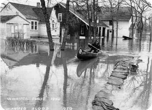 Canoe patrol of flooded neighbourhood during the 1950 flood.