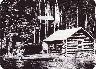 Grey Owl at his cabin on Ajawaan Lake, Prince Albert National Park.