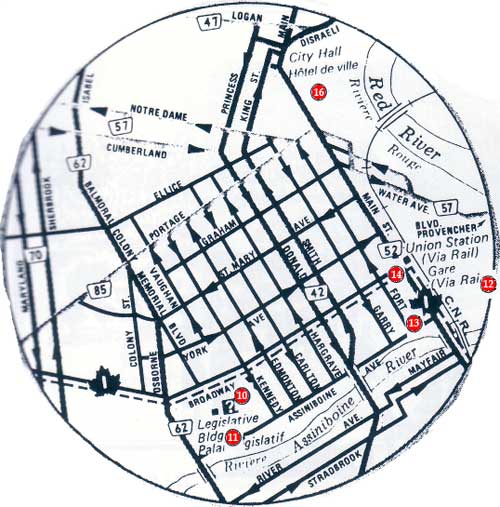 At the corner of Kennedy Street and Broadway a bust of George-Etienne Cartier [10], a Father of Confederation, honours his role in guiding the Manitoba Bill through the Canadian Parliament in 1870. On the riverbank south of the Legislative Building a provincial plaque as well as a planned new statue of Louis Riel [11] are fitting tributes to his role in the founding of Manitoba.