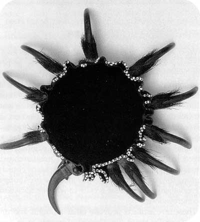 Bear claw necklet. Grizzly claws, red wool cloth, glass beads; incised metal binding on one claw.