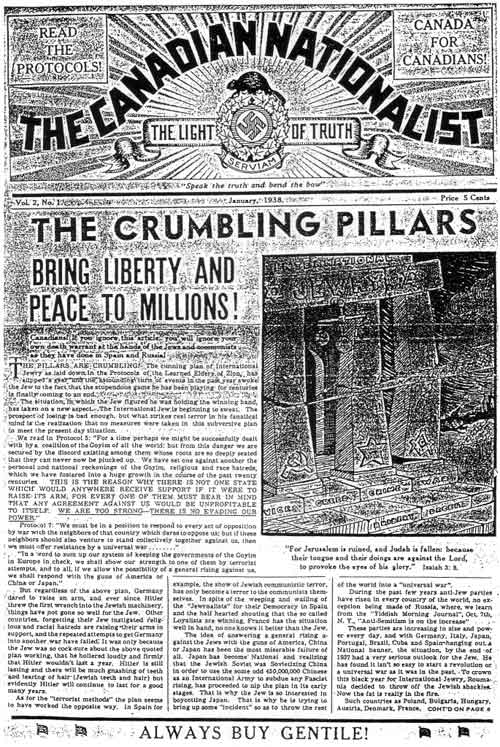 Front page of The Canadian Nationalist, the anti-Semitic newspaper of Canadian National Party (January, 1938)