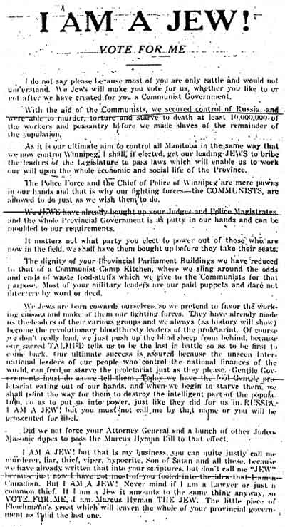 Propaganda became nastier as Whittaker became bolder. In 1936 the C.N.P. informed Winnipegers: “Jews are born Cowards,” and “I AM A JEW! But that is my business, ... call me murderer, killer thief, viper, hypocrite, Son of Satan ...” [44] The Canadian Nationalist with headlines such as “Canadians awake! International Jewry is the cause of wars, depressions and world unrest!,” [45] warned that “if you ignore this article, you will ignore your own death at the hands of Jews ...” [46] The Evil Elders of Zion by a Winnipegger J. N. Sturk, urged Jews to “eshew all arrogance of spirit and brazen attempts at self justification, and to afflict their souls in repentance.” [47]