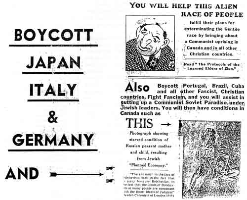 Although Whittaker’s rallies and exercises were an important part of his platform, his principal anti-Semitic messages were communicated through hate literature. Using pamphlets and a racist newspaper called, The Canadian Nationalist, the C.N.P. reproduced all the myths of anti-Semitism. The Protocols of the Elders of Zion, a document circulated in Czarist Russia warning of a Jewish takeover was distributed. In a 1935 issue of The Canadian Nationalist, Whittaker stated that Hitler’s regime had the potential “of placing the Jew just where be belonged.” [42] Propaganda pamphlets were particularly deceptive. One in particular read on the cover “Boycott Japan, Italy and Germany, and ...” Inside the phrase continued: “You will help this alien race of a people,” caricatured by a large nosed Jew, unshaven, with flies buzzing around his head. The pamphlet urged a boycott of Jewish goods, and support of German and Italian goods. The message was -- defeat the Jew and in turn communism would fall. Another C.N.P. document urged readers to “Unite solidly against ... Jewish inter-national, economic and financial domination.” [43] Ironically, the Jew was portrayed as both a communist and capitalist, and both were condemned.