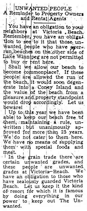 Many institutions in Manitoba practiced anti-Semitism. Jews were not welcomed at some recreational clubs. In 1948 the Puffin Ski Club made its policy official: Jews were simply not welcome. An application of an eleven-year-old boy was refused because “Jews are aggressive and can take over the club.” [17] In that same year the press revealed that the middle class residential development, Wildwood Park, as well as the upper class exclusive neighbourhood of Tuxedo, excluded Jews. [18] These areas were mainly populated by wealthy Anglo-Saxons. Jews were “persona non grata” at Victoria Beach, a popular summer retreat for “WASPs.” After a Jew purchased a cottage there, the local newspaper urged residents to “keep our beach free of ... the unwanted grades.” [19]