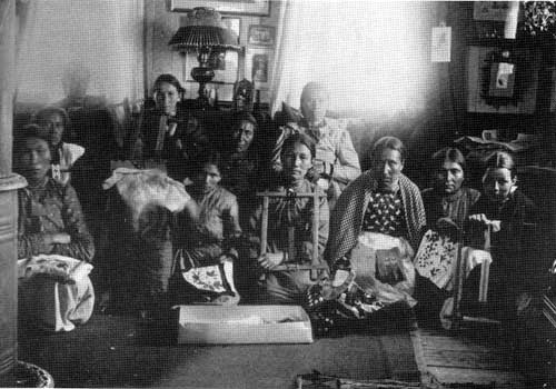 Cree women with handiwork at the mission house at York Factory, circa 1910.