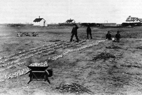 Aboriginal students working in the fields of the Residential School at Elkhorn, Manitoba, circa 1915. The Residential School was “designed as a total institution combining religious teaching and work to instill Christian and bourgeois habits and values.”
