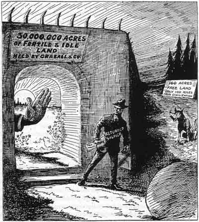 The issue of soldier settlement focused attention further on the fertile acres in the hands of individual and corporate speculators, as the Dominion lands available to returned soldiers were not in desirable locations. These lands were in forested areas, the Interlake region of Manitoba, the Peace River country or the arid Palliser’s Triangle. They were remote from railways, or they required clearing, or were of doubtful fertility. For these very reasons no others had entered for homestead on these lands, or had failed to “make good” on them. In the Western press there was agreement on the idea that returned soldiers should not be expected to settle these remaining Dominion lands where there were no schools, towns, railways or other facilities. The government was called upon to take over the unoccupied land held by speculators, to “conscript” it at a price about half its value. [26] “These young men were conscripted and forced to accept less than half their earning capacity in civil life,” declared the Grain Growers’ Guide, “why should the government not take over the idle land at one-half its value.” [27] A cartoon in that periodical dramatically depicted a returned soldier being denied access to 30,000,000 acres of fertile and idle land by the hand of a speculator, his alternative being 160 acres of free land 100 miles from “civilization”.