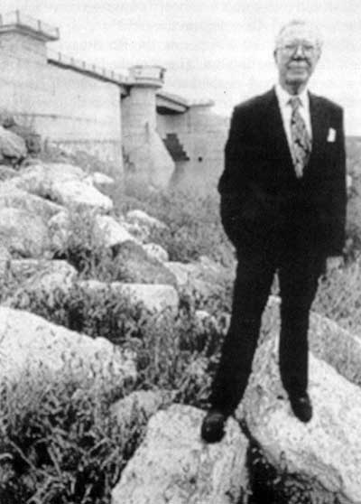 Senator and former Premier, Duff Roblin with Inlet Control Structure in background.