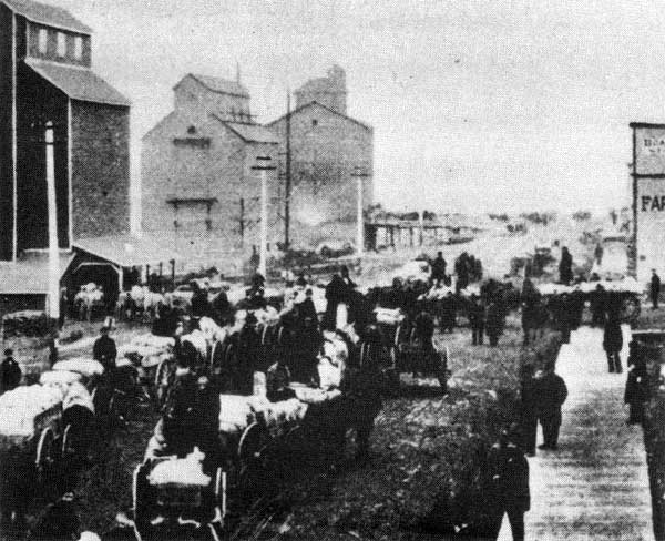 Wagons loaded with bags of grain, awaiting delivery to elevators in Brandon, circa 1888.