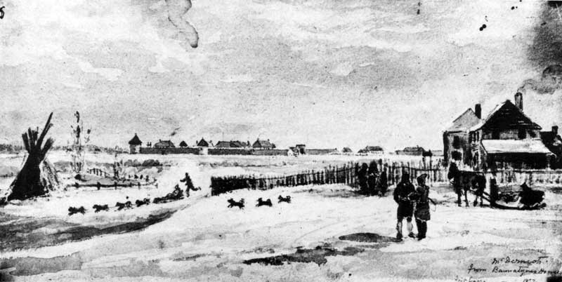 “McDermot’s from Bannatyne’s house”, painted in 1857. In the background is Upper Fort Garry at the forks of the Red and Assiniboine rivers.