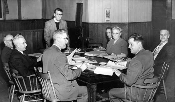 The Portage la Prairie City Council gathered around the table at its last meeting of 1952. Shown counter-clockwise are: N. K. Weber, C. B. Astbury, W. F. Hyde, A. R. Barrett, T. N. Metheral, Mrs. J. B. Wishart, W. S. Ashman, and Mayor H. L. Henderson. “The council … launched into a heated debate” shortly after the photograph was taken. Portage Daily Graphic, 23 December 1952.