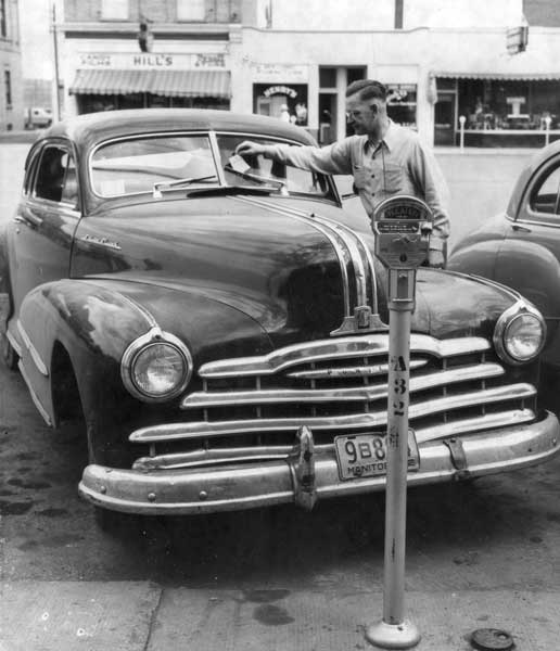 How Not to Park. New parking meters along Portage’s Saskatchewan Avenue caused consternation among local drivers, including Lloyd Hilton shown here, who received a ticket for parking directly in front of the meter rather than to the right of it. Portage Daily Graphic, 14 August 1952.