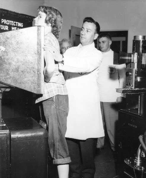 Portage resident Anne MacVicar (later an active member of the Manitoba Historical Society) receives a diagnostic x-ray at the tuberculosis clinic. Portage Daily Graphic, 7 August 1952.