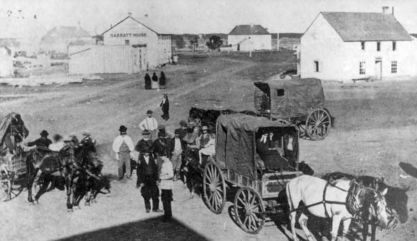 The Broadfoot party of settlers stands at the intersection of Portage and Main in this June 1872 photo by James Penrose.