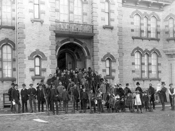 Arbor Day 1887 was proclaimed as a public holiday for 10 May. Rural members of the legislature left Winnipeg to spend the day with their constituents. The courts were closed, and CPR shopmen were given the day off. But most businesses remained open because the city council made no effort to close them. The students of Manitoba College did not get the day off either, as they were in the middle of examinations. Nevertheless, a few of them gathered on the steps of the college building, along with some of their professors and neighborhood children, to have their photograph taken before planting trees around the campus. Despite these and other showings of civic pride at city schools, the next day’s newspaper was critical of the results as a whole: