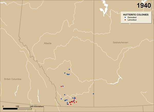 Map 5. Dariusleut and Leherleut colonies in Canada, 1940.