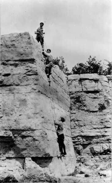 Members of the Dolomite Club climbing at Gunton Quarry, Manitoba, 1940s; top to bottom: Ferris Neave, Margaret Fleming, Marjorie Macleod.