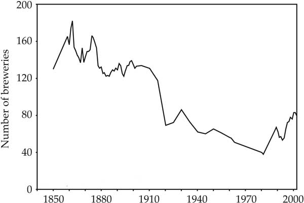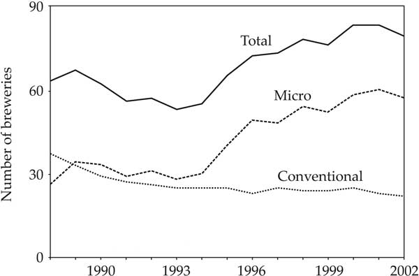 The rapid expansion of the Canadian brewing industry in the 1990s, as measured by the number of breweries, is largely accounted for by the emergence of a new kind of brewer—the microbrewery. [74] In fact, the microbrewery has much in common with the original brewers—small scale and selling, at least initially, to a local market. As Stephen Beaumont puts it, modern microbreweries “hark back to a time when brewing companies were local businesses producing beer for local people.” [75] There are often more concrete linkages between the traditional brewers and the modern microbreweries as well. Many of the latter are reincarnations of Canada’s traditional breweries that had disappeared during either Prohibition or the wave of consolidation led by the national brewing corporations. The modern microbrewery, Fort Garry Brewing Company of Winnipeg, for example, was reopened in 1994 after the original Fort Garry Brewery, also of Winnipeg, was bought by Molson in the 1960s and subsequently closed. [76] In this instance there was continuity in family involvement as well, as the Hoeschen family were principals in both the original and the new Fort Garry. The data on the recent expansion of Canada’s brewing industry is even more pronounced if brewpubs are included. For instance, in 1996, while there were seventy-two breweries—and notably the microbrewers outnumber the conventional brewers by two to one—the number jumps to one hundred and fifty-five if brewpubs are included.