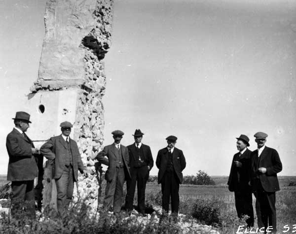With a long and honourable history like that it need not be a matter of surprise that neighbouring municipal and social organizations have selected the site of Fort Ellice as a suitable place to be marked by a commemorative cairn, and last summer, on 15 July [1930], the Golden Anniversary of Manitoba’s admission into Confederation, the foundation was laid for the Memorial Cairn. It is located, not within the area of the old fort enclosure, but a few yards away on the brow of a hill where it can easily be seen by travellers on the railway in the valley below. The laying of the foundation was marked by a picnic at which four thousand people were said to be present. Speeches were made in English and French. There were political addresses, and there were local reminiscences by pioneers. There was an account of the history and achievement of the Hudson’s Bay Company, there was reading of extracts from the logbooks of the Chief Factors of the fort, dating back to 1856. The trowel for laying the foundation stone was handled by Judge McKay, of Regina, who traces his ancestry to a line of Hudson’s Bay Company and the celebration wound up by a baseball match between two local clubs.