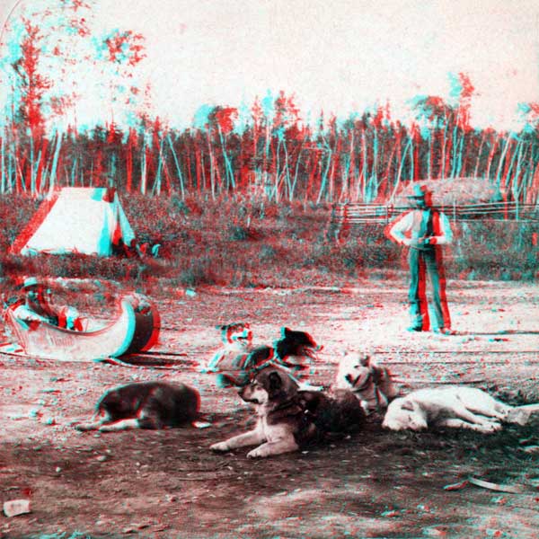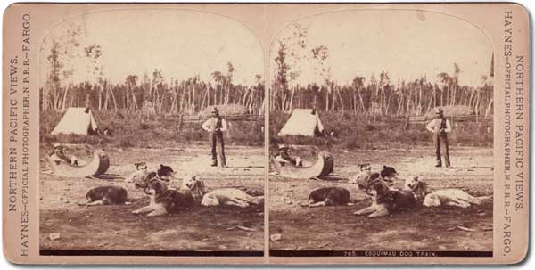 “Esquimau dog train.” This playful view of a dog team and carriole (sleigh) was taken in July 1881, probably at the Hudson’s Bay Company post at Barren’s River, by American photographer Frank Jay Haynes (1853-1921). Although based in Fargo, Dakota Territory, and better known for his grand photographs of Yellowstone National Park, Hayes visited Canada at the invitation of the Canadian Pacific Railway. Near Selkirk, he boarded the HBC vessel Colvile for its seven-day circuit of Lake Winnipeg. Haynes later travelled by rail to the end of tracks a few miles west of Portage la Prairie, then transferred to a horse-drawn wagon for the remainder of his trip to Fort Qu’Appelle, northeast of present-day Regina.