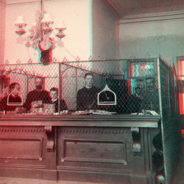 Merchant’s Bank in Emerson, June 1882. Someone has identified the five people in the photo as (left to right) Conn, King, Lanther, Snow, Germaine, and Evans. Security was obviously a concern, with the tellers surrounded by an ornate metal cage. Child labour laws were lax, as Lanther appears barely tall enough to peer over the desk. He might have been underwater during the flood earlier that year. The high water mark is clearly visible in another view of the bank, taken outside, above the head of a man standing beside it.
