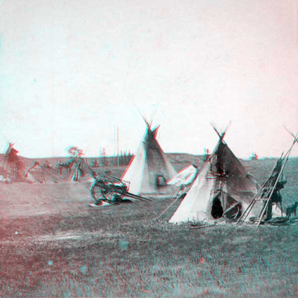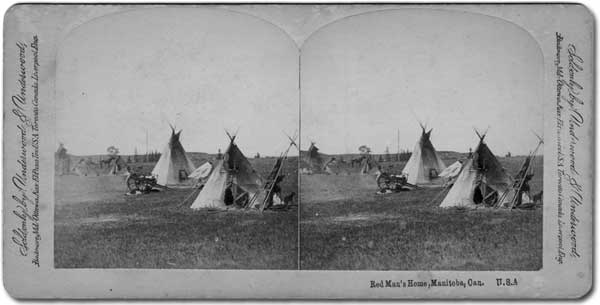 “Red Man’s Home.” The location of this undated stereoview, published by Underwood & Underwood, is confusingly given as “Manitoba, Canada, U.S.A.” Views of aboriginal people and practices were popular; most prairie photographers offered photos like this one for sale—some flagrantly rephotographed from the work of other photographers—to fulfill the demand by new arrivals wanting to inform “folks back home” about their new home.