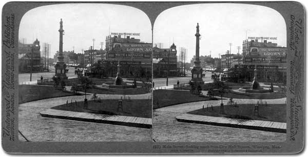 Volunteers monument on the square in front of the Winnipeg City Hall, circa 1900. The tall monument was unveiled on 28 September 1886, in commemoration of the men who served in the military during the 1885 North-West Rebellion. Among the Main Street businesses visible in this view are Ryan’s Boot and Shoe House, owned by prominent Manitoban Thomas Ryan, and White & Manahan Clothiers. A smaller monument to the right, surrounded by a fountain and pool, commemorated the sixtieth anniversary of Queen Victoria’s reign in 1897. The Victoria monument was later moved to the English Garden at Assiniboine Park, rejoining the “little boy with the boot” that was beside it at this time.