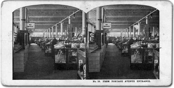“Meat packing room.” Winnipeg was the wholesale meat capital of the prairies, being home to such large firms as Swifts (shown here) and Gordon, Ironside & Fares. This undated stereoview by the Keystone View Company was intended for educational use, with text and questions on the back side to encourage viewers to ponder its subject matter: “Upstairs in this meat packing house the telephone has been ringing busily this morning. The butchers of Winnipeg, Canada, need many things for their meat markets today. The orders are written down and taken down to the shipping room. The order clerk hands the orders to the men and they hurry to fill them.”
