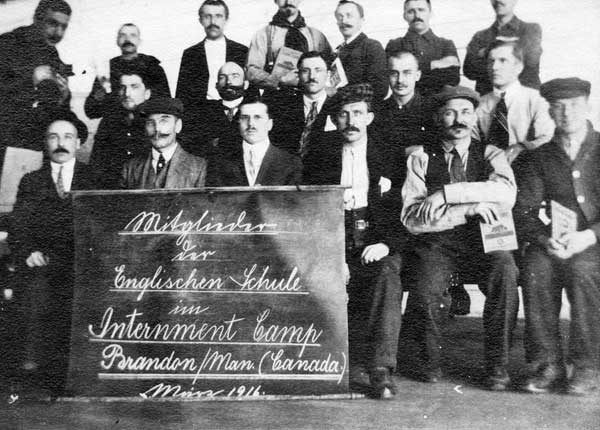 ‘Aliens’ learn English. Reinhold Salzmann, bearded in the second row, was born in Bodeschwingh, Germany in 1876. He immigrated to a farm near Punnichy, Saskatchewan in June 1913. The next year, he was arrested and interned at Brandon, leaving his wife and three young children to mind the farm. In this photo from March 1916, he joined other internees in an English language class. When the Brandon Internment Centre closed later that year, Salzmann was moved to one at Morrissey, BC where he remained until the end of the war. He returned to his farm, moving to Winnipeg in 1932. He died there in 1969, never having expressed any hard feelings over his internment.