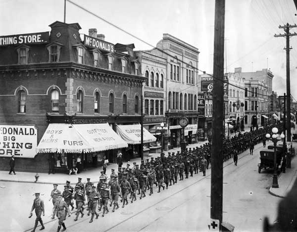 Military might on Brandon streets. The First Depot Battalion marching on Rosser Avenue, 4 June 1918.