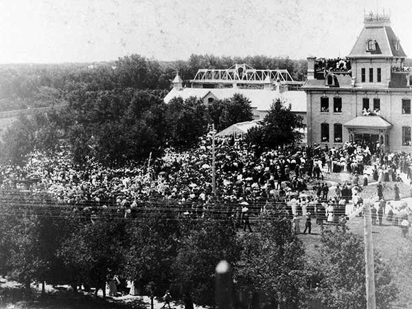 Queen Victoria’s Diamond Jubilee, celebrated in 1897, brought out revelers to the home of her representative in Manitoba, as seen in this view by Winnipeg photographer Frank D. Blakely. They looked out of its every window, and gathered on its roof. The stout brick stable is visible in the background, as is the iron bridge across the nearby Assiniboine River.