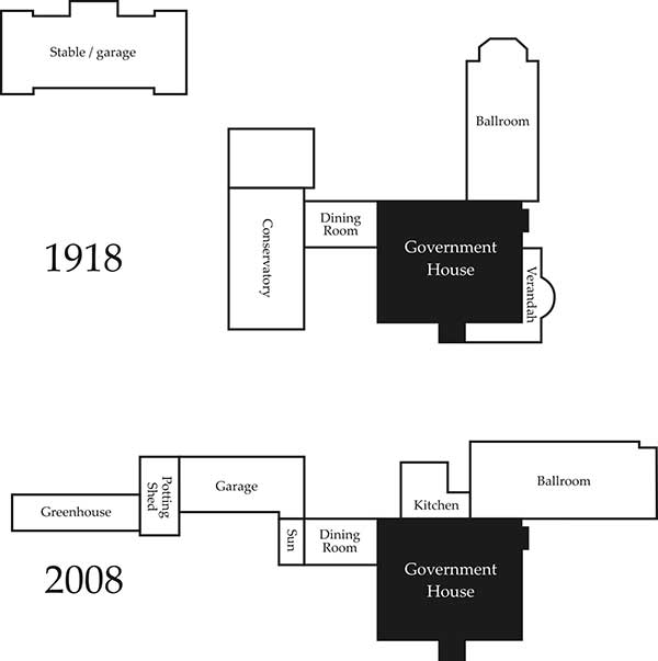 The footprint of Government House has changed dramatically in eighty years. Virtually all its outbuildings in 1918 have been replaced by a series of interconnected structures comprising some 20,000 square feet.