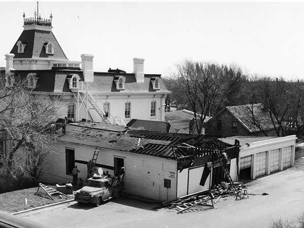 Building tenders were called in 1881 and the two lowest were submitted by A. Charlebois of Montreal ($23,133) and Joseph Williams and F. J. Bowles of Selkirk ($23,995). Although Charlebois’ bid was lower, he would not guarantee his quote unless he also received the contract for the Legislative Building. John R. Lyons of Ottawa had quoted a lower price on the latter and so Charlebois lost out on both fronts. The contract for the Lieutenant Governor’s residence was awarded to Williams and Bowles, and work began in early September 1882. By late December the superstructure and tin roof were finished. The interior and most of the outbuildings were completed during 1883. In March, Bowles had also received the contract for the stables and a combined wash-house, ice-house and woodshed. The stables were located approximately thirty-four metres southwest of the house to keep the “sweet” smell of the horses from drifting towards the residence. The second building was situated closer, some eleven metres from the southwest corner of the house, for the convenience of the servants who stocked the ice box and wood bins. Everything was in readiness by the time Lieutenant Governor James Cox Aikins moved in during the third week of September. The house had already been connected to the telephone exchange, and it was only a few weeks before the pipes were laid to provide fresh water via the Winnipeg Water Works.