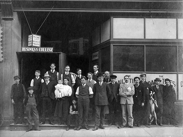 Look at the accompanying photograph of a group of people—and a dog—standing in front of a building under a sign for the Wheat City Business College. I purchased it four years ago from a seller in Florida, assuming that it had been taken in Brandon, our “Wheat City.” But is there anything else in the photo that supports—or refutes—my assumption? My first step was to check if G. F. Barker’s 1977 book Brandon: A City, 1881–1961 included any reference to the business college. Sure enough, page 90 told me that, in 1904, J. W. Beveridge and F. E. Werry resigned as instructors in the commercial department of Brandon College to establish their own college in a building owned by the lumber firm of Hughes and Company. So it is probable that the photo was taken in Brandon.