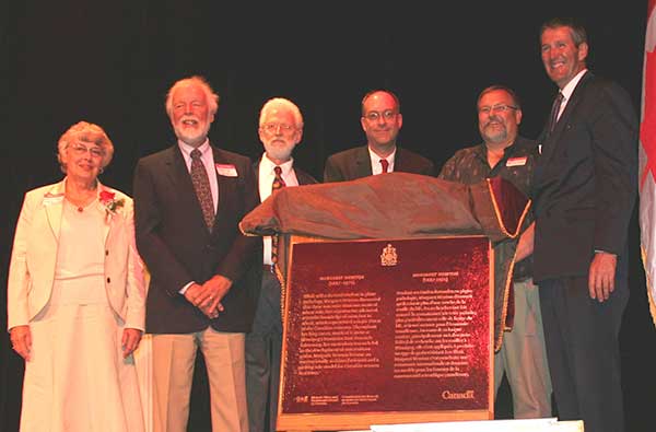The Newton plaque unveiling was done by (L-R): Mrs. Margaret Kemp, niece of Margaret Newton; Dr. David Swales, nephew of Margaret Newton; Dr. Robert O’Kell, Manitoba Member of the Historic Sites and Monuments Board of Canada; Dr. James Kolmer, United States Department of Agriculture; Dr. David Wall, Cereal Research Centre; and Mr. Brian Pallister, MP for Portage-Lisgar.
