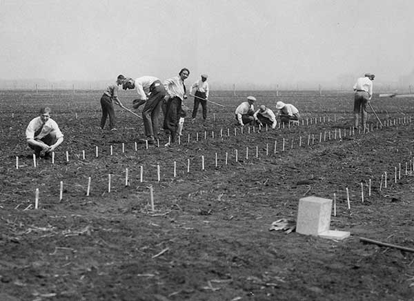 Margaret Newton seeding rust plots with staff of the Dominion Rust Research Laboratory in an undated photograph.