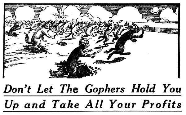 Mechanization during and after First World War was undoubtedly responsible for remarkable gains in farm crop yields. But this was only a benefit if most of the crop ended up in the farmer’s granary. Consumption in the field by pests represented an unacceptable loss, especially when every bit of food was needed to sustain Canada’s war machine overseas. Public enemy number one was the “gopher,” a collective name for three common species occurring in Manitoba at the time: the Flickertail or Richardson’s Ground Squirrel (Spermophilus richardsonii), the Scrub Gopher or Franklin’s Ground Squirrel (Spermophilus franklinii), and the Striped Gopher or Thirteen-Lined Ground Squirrel (Spermophilus tridecemlineatus). By feeding on developing grain heads, gophers were a threat that no farmer could ignore. During the summer of 1917, for example, there were an estimated 10 million gophers in western Manitoba, at densities ranging from 5 to 30 per acre. They could consume or spoil an estimated two and a quarter million bushels of grain, so killing even two million of them would translate into a saving of half a million bushels. The threat to the Allied war effort was clear. One especially imaginative advertisement in the Western Municipal News magazine portrayed gophers as invading German soldiers, replete with spiked helmets and scythes.