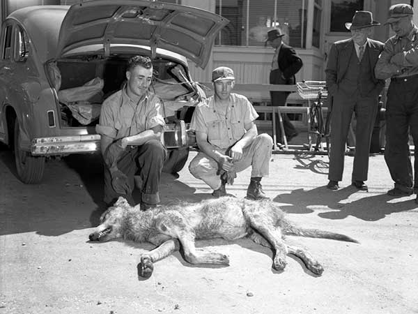Wolf hunters. Leslie Poole and Verne Ferris display a timber wolf they shot at Macdonald near Portage la Prairie, 1952.