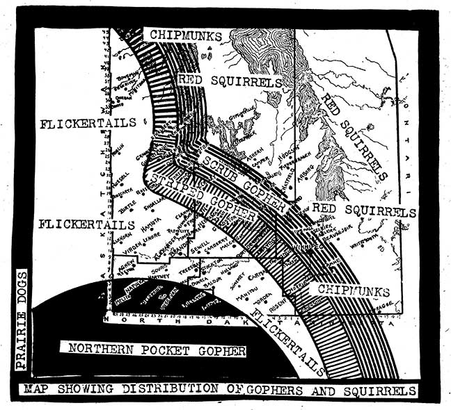 Three gopher species were widely distributed across much of southwestern Manitoba, as shown in this 1918 map from a provincial government pamphlet advocating their eradication.