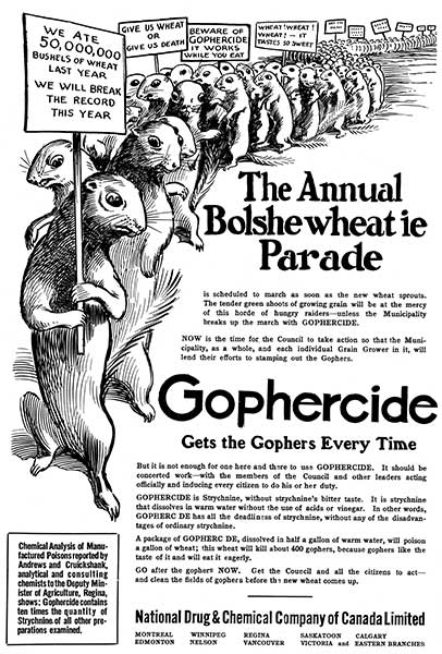 Radical gophers. In the aftermath of the Russian Revolution, gophers were portrayed as “ Bolshewheaties” in this 1920 advertisement for gopher poison from the Western Municipal News.