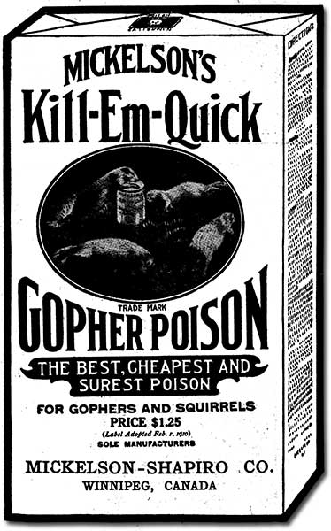 A 1918 government pamphlet advised that “gopher shooting with a .22 is good business as well as good sport,” but the primary weapon in the farmer’s arsenal against gophers was poison. Anton Mickelson, one of the primary purveyors of gopher poison at the time, became well-known in municipal circles, and a regular attendee at annual conventions, where he offered wholesale prices to municipalities. He arrived on the Manitoba scene around 1912, when his company and others began marketing such products as Kill-Em-Quick, Ready Rodo, Gophercide, Bolduan’s Poisoned Grain, and My Own. Home-made recipes with names like North Dakota Mixture and Canadian Vinegar Mixture were also available. The active ingredient in all of them was strychnine, and commercial formulations were usually a greenish-blue liquid smelling strongly of vinegar. Mixed in a gallon pail of water, wheat or oats would be added until the solution was fully absorbed. Then the poisoned grain would be spread on the ground at places frequented by gophers. It was well known that gophers could travel considerable distances from their burrows to grain fields, so non-agricultural sites were also targets for gopher control. A 1912 resolution by the Union of Manitoba Municipalities (UMM) urged railways to destroy gophers burrowing on their rights-of-way. A 1917 resolution wanted the Municipal Act amended to give municipalities the right to pass by-laws making gopher destruction compulsory on all residents, and a 1919 resolution wanted municipalities to be able to bill land owners who were derelict in their gopher-killing duty. In the 1930s, the UMM wanted municipalities to prohibit the trapping of weasels—natural gopher predators—and some municipalities gave out free poison.
