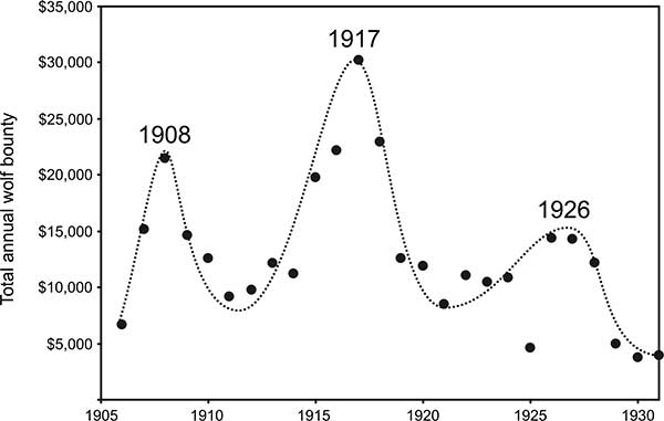 The total annual wolf bounty paid in Manitoba, between 1907 and 1931, peaked every nine years, probably as wolves flourished when their prey animals did so too. This runs counter to the argument by farmers that wolves thrive by eating their livestock. Data were obtained from budgetary summaries compiled and published annually by the provincial government.