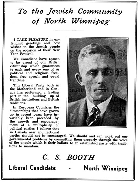 Booth and the Manitoba Liberal and Progressive Election Committee advertised in The Jewish Post, Dos Yiddishe Vort, The North-Ender, The Winnipeg Evening Tribune, and the Winnipeg Free Press. Keenly aware of the anxiety of Winnipeg Jews, Booth’s advertising included a statement made by King saying that “We Don’t Want Any Hitlerism or Fascism in Canada”. Booth claimed that the Liberal Party had “performed a leading part in the building up of British institutions and traditions”, including political and religious freedom, free speech, and the equal franchise, whereas the “growth and encouragement” of a multiplicity of political parties had led to dictatorship in continental Europe. His message was clear: in Canada, “new and factional parties should not be encouraged” and governmental problems could be solved by voting for “an established party with traditions to maintain”. [43]