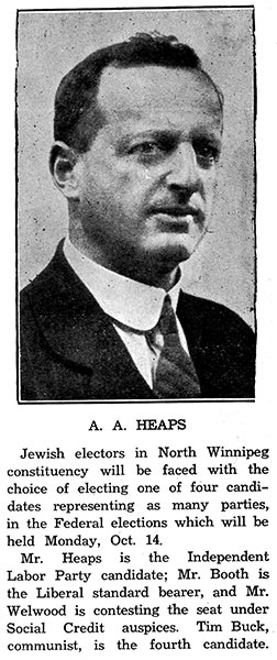 Heaps, who was born in Leeds, England, arrived in Winnipeg in 1911 and obtained employment as an upholsterer with the Canadian Pacific Railway. He soon became active in the local labour movement, serving as the Winnipeg Trades and Labour Council statistician and secretary of the Labour Representation Committee, the trades unionists’ political organization. He was elected as a City of Winnipeg alderman for the North End’s municipal Ward 5 and then consolidated Ward 3, and was arrested in 1919 as a leader of the Winnipeg General Strike. Long before the federal election of 1935, therefore, Heaps had become a formidable political force. As Dos Yiddishe Vort commented that year, Heaps had an “outstanding reputation” and was “very popular in labour circles and in the community at large and even in the general non-Jewish circles he [was] regarded as very strong.” Elected to Parliament in 1925 as the ILP candidate for Winnipeg North, and re-elected in 1926 and 1930, Heaps had made “tireless efforts as the most credible economic critic in the [House of] Commons” during the 1920s and early 1930s. He had been a member of the “Ginger Group” led by James Shaver Woodsworth, the ILP, then CCF leader and MP for Winnipeg North Centre, and with Woodsworth, had been, and remained, a forceful and “impressive” spokesman for working class interests and a champion of social welfare measures such as unemployment and sickness insurance. The two men had been instrumental in bringing about the introduction of old age pensions in 1927. [15]