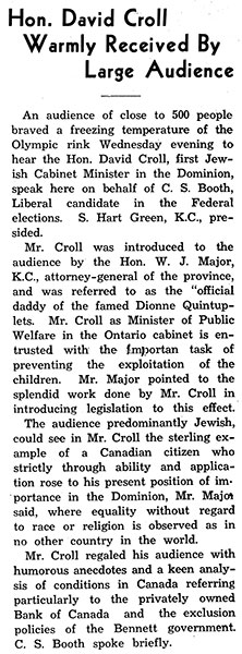 In an effort to persuade Jewish voters to support Booth, Winnipeg North Liberals invited David Croll, the Ontario Minister of Public Welfare and Municipal Affairs, who was advertised as “the first Jewish member of the Legislature to hold a cabinet position”, and who had become known nationally as the guardian of the Dionne Quintuplets, to speak in Winnipeg on 9 October. The arrangements were made after a meeting of about fifty Jewish women at the home of S. Hart Green, who was chosen as chairman of the reception committee. As well, a Jewish women’s Liberal campaign committee to support Booth was formed. The predominantly Jewish audience, assembled in the Olympic Rink, heard Green, who presided, urge them to vote according to the principles advocated by a candidate and not on the grounds that he was a co-religionist or neighbour. Booth spoke briefly and Croll was introduced by Attorney-General Major, who stated that Croll was “the sterling example of a Canadian citizen who strictly through ability and application rose to his present position of importance in Canada” where “equality without regard to race or religion is observed as in no other country in the world.” In turn, Croll “regaled” the assembly with “humorous anecdotes” and a “keen analysis” of conditions in Canada, particularly regarding the Bank of Canada and the Bennett government’s restrictive immigration policy. Although Croll’s comments in a newspaper interview about the positive necessity and inevitability of “state medicine” which would help “those people who are unable to pay a doctor”, may have appealed to many Jewish electors, Croll’s appearance most likely was not a factor in the election outcome. The Liberals unsuccessfully attempted to have the presidents and congregations of all Winnipeg synagogues arrange a reception for Croll. Furthermore, “only” 400-500 people came to hear him speak, apparently he “did not want to undertake [the] trip” but was “forced to do it by the party”, and in his speech, he almost entirely omitted any attack on Heaps. [45]
