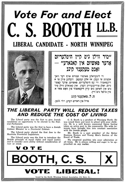 Jewish and other North End electors were informed that a vote for Buck would “add strength to subversive anti-Canadian forces” seeking to destroy democratic self- government, while a ballot for Heaps was support for a “rigid program of socialism of your business and state control of your life”. A vote for Booth, however, would be an endorsement of “an effort to re-open channels of trade and commerce for Canada”, “a revival of actual government by Parliament”, and “real control of the people’s finances by the people’s elected representatives.” Booth also claimed that the Liberal Party was the first to nominate Jewish candidates for Parliament, the first to have a Jewish Cabinet Minister, and the first to help elect a Jew to the Manitoba Legislature. [44]