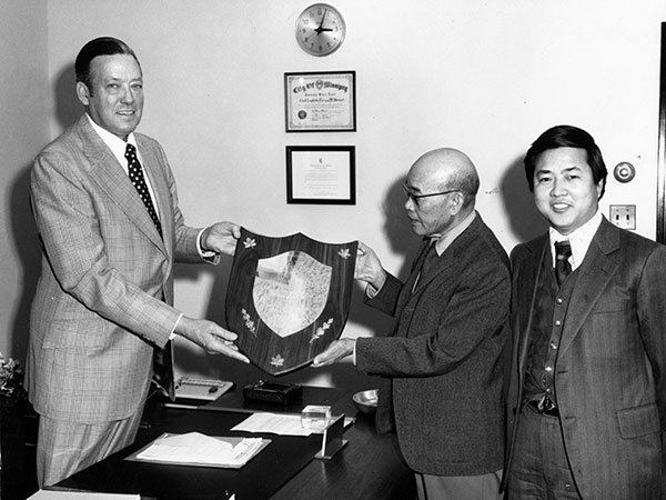 Charlie Foo (centre) and Philip Lee (right) present a plaque of appreciation from the Chinese-Canadian community to Winnipeg Police Chief Norm Stewart, circa 1972.